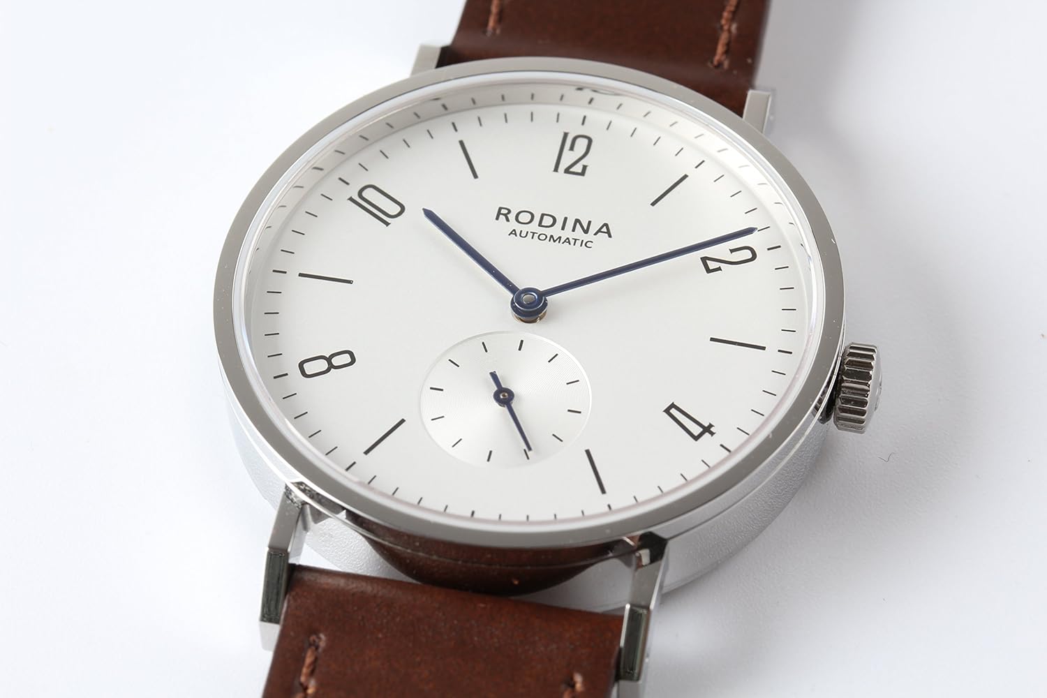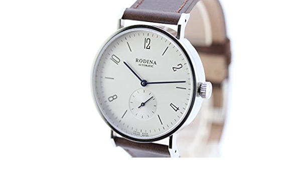 Amazon Com Authentic Rodina R005 Automatic Bauhaus Style Wrist Watch Arabic Silver White Dial Brown Strap Seagull St17 Movement Watches